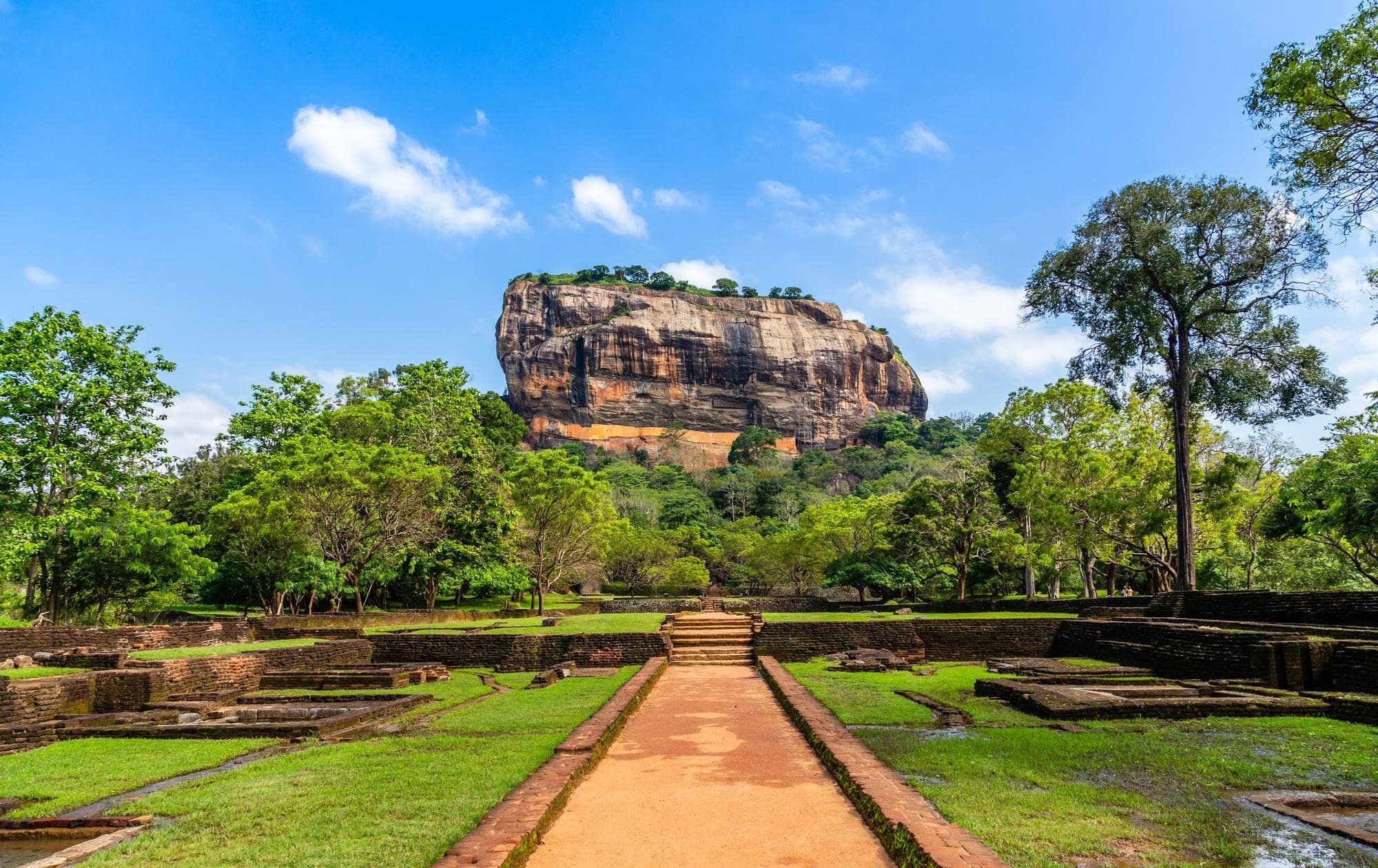 Sigiriya, also known as Lion Rock, is a giant rock fortress in Sri Lanka that rises about 200 meters above the land. It was built in the 5th century by King Kashyapa as his palace and stronghold. The rock is famous for its ancient fresco paintings of women, the remains of a huge lion-shaped entrance, and its advanced water gardens with fountains that still work today. At the top are ruins of the royal palace, and from there you can see stunning views of the forests and villages around. Sigiriya is a UNESCO World Heritage Site and is often called the Eighth Wonder of the World.